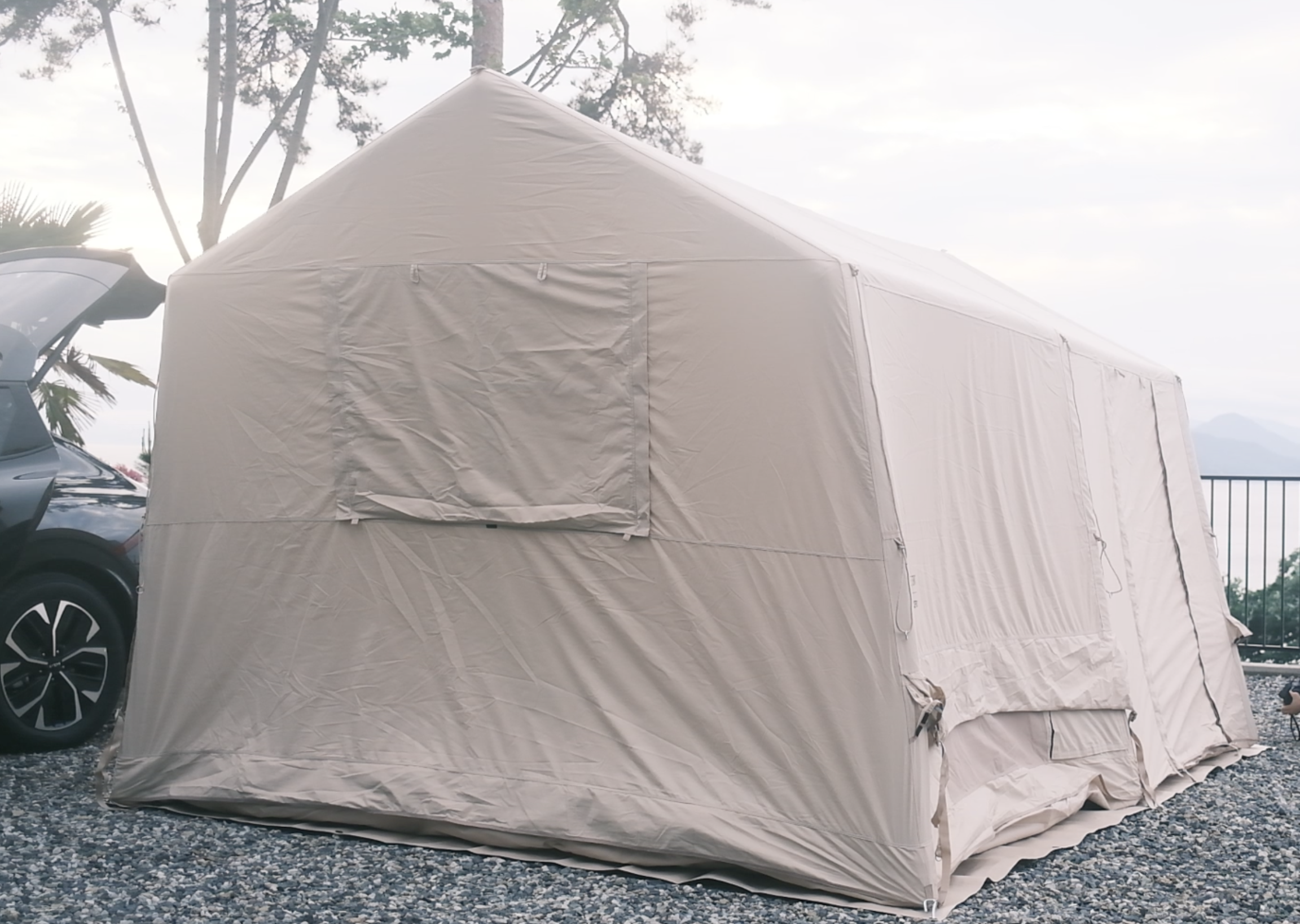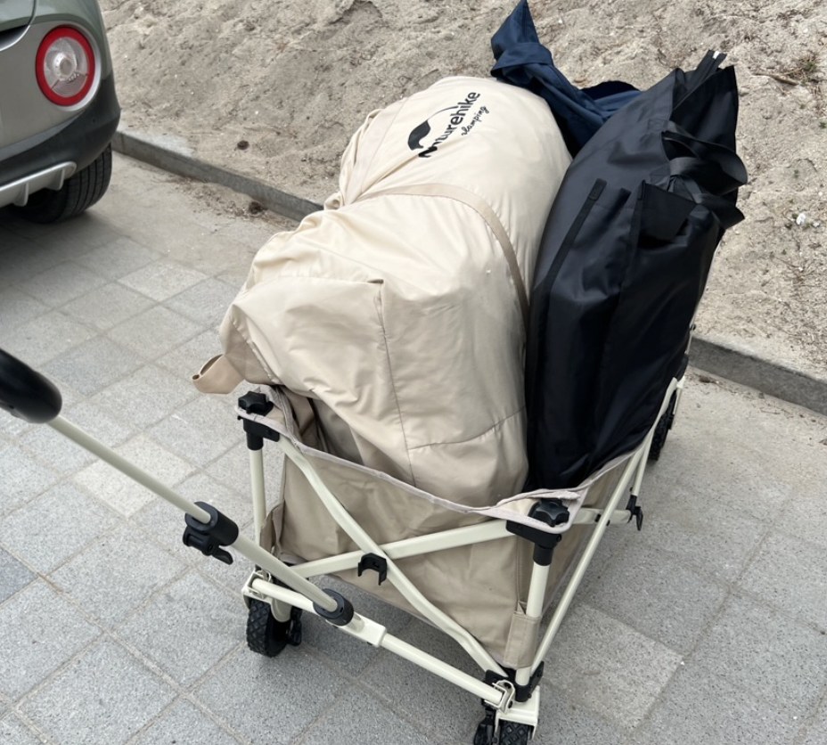네이처하이크 에어텐트 12x의 부피는 기아의 니로, EV6 트렁크를 가득 채울 정도로 일반적인 텐트들에 비해 부피가 많이 큰 편이다. 보기보다 무게감이 상당한 편이므로 웨건 등을 활용하는 것이 필수. 캠핑장마다 사정이 다르겠지만 전에 방문했던 강원도 강릉의 연곡솔향기 캠핑장은 데크 사이트와 주차공간의 거리가 제법 있는 편이었다.
