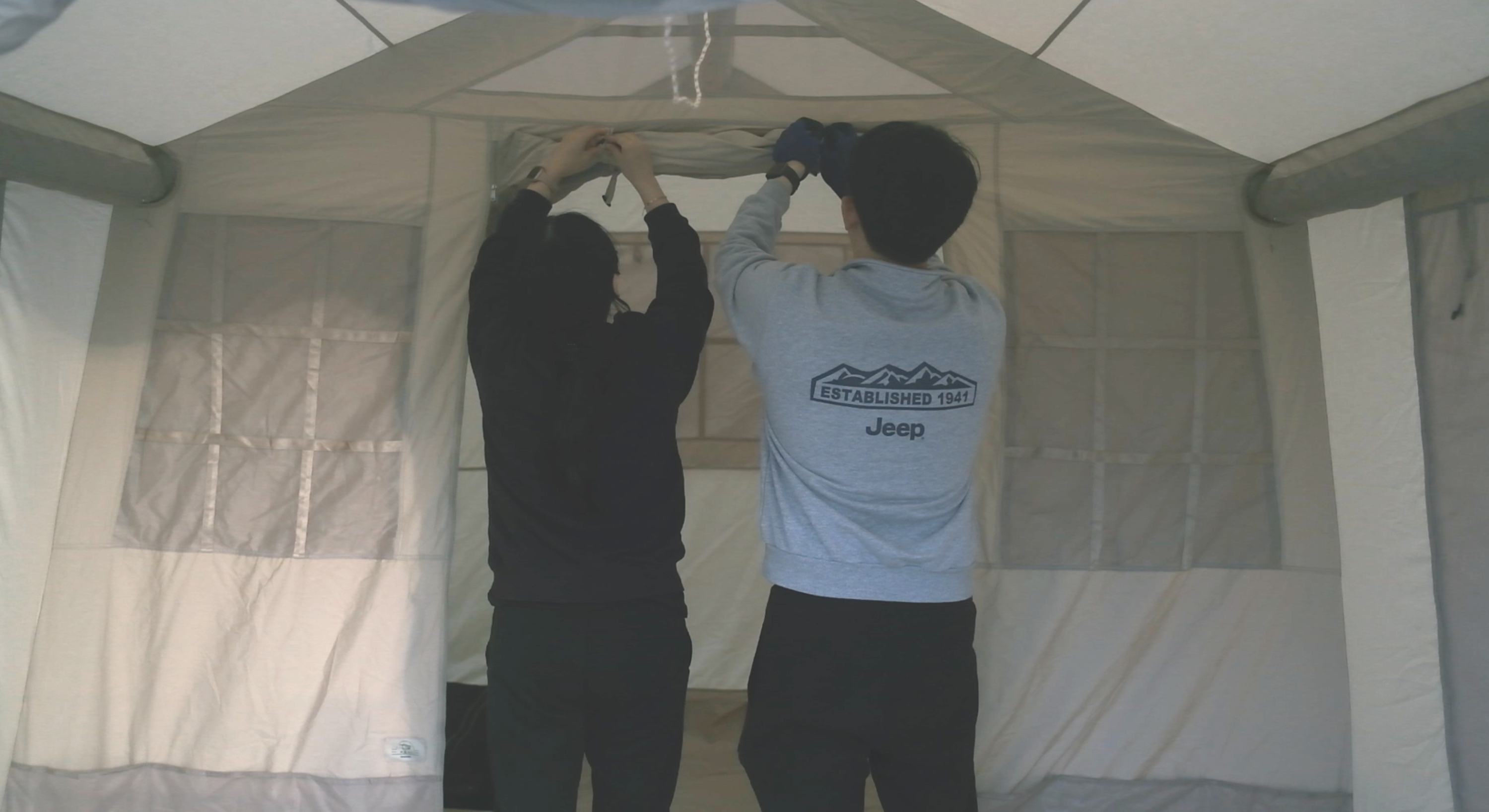 3개의 모든 공기 밸브에 바람을 집어 넣엇다면 이제 기둥을 세울 차례다. 바깥이나 텐트 입구를 비집고 들어가서 하늘 방향으로 텐트를 밀어 올리면 자연스럽게 텐트가 펼쳐지게 된다. 이 과정에서 바람이 불면 텐트가 밀려날 수 있으니 꼭 팩 다운을 먼저 하고 나서 피칭을 하도록 하자. 피칭에 성공했다면, 이제 세로축 긴 부분의 중간에 있는 고리에도 팩다운을 하면 피칭은 마무리가 된다.