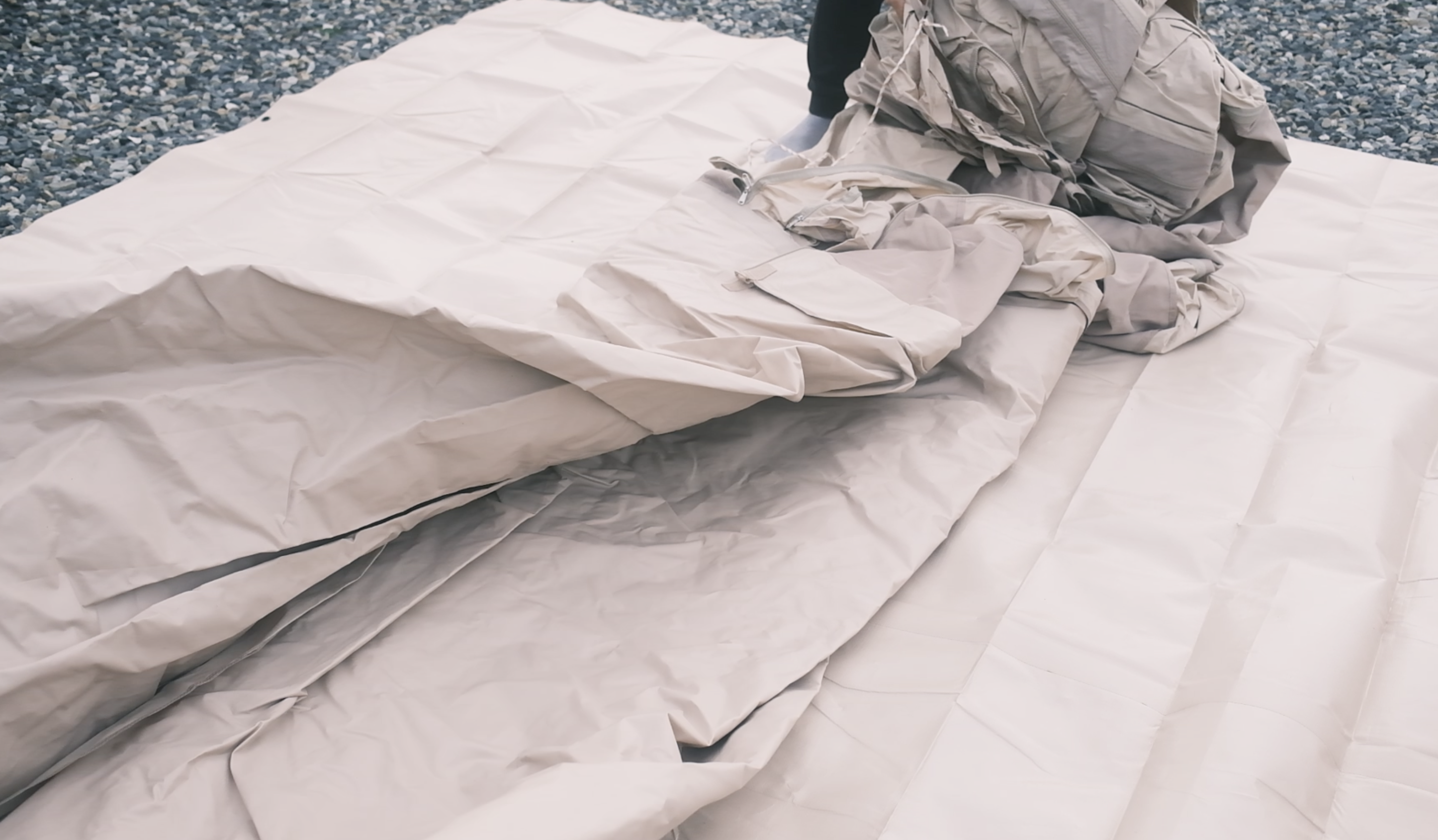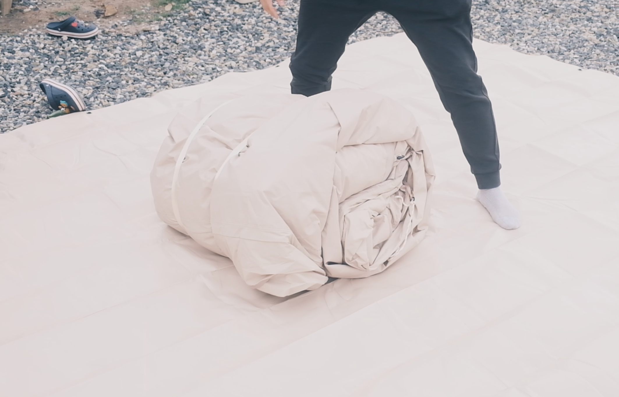 텐트 전체를 펼치기 전에 입구가 어디인지 미리 확인하는 것이 중요하다. 구매하고 나서 처음 개봉할 때에도 아마 메쉬창으로 보이는 소재가 보일텐데, 이 메쉬창이 텐트의 입구라고 생각하면 된다. 메쉬창이 보이지 않을 땐 두께감이 약간 더 얇은 쪽이 입구라고 생각하면 쉽다. 주의해야 할 점은 다 펼치고 나서 텐트의 입구를 찾으면 혹시라도 입구 방향이 원하는 방향과 다를 때 위치를 변경할 때 무게 때문에 곤란해진다는 점이다. 처음에 한번 돌돌 말렸던 부분만 펼치고, 그다음 입구가 어디에 있는지 확인한 다음 펼치는 것이 중요하다.