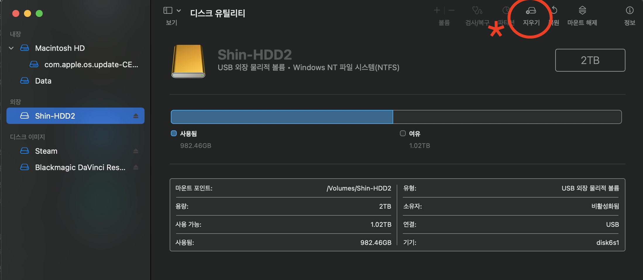 디스크 유틸리티 창에서 해당하는 외장하드를 선택한 후