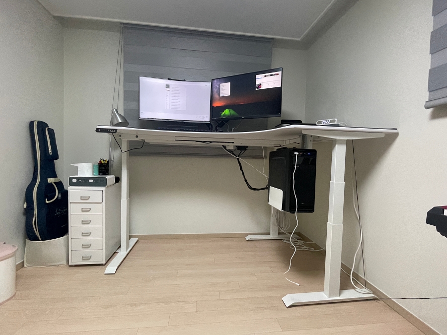 또 한가지 장점은 컴퓨터 본체에 꽂혀 있는 USB 선들을 꼽거나 빼야 할 때 처럼 본체 뒷편을 봐야하는 일이 있을 때, 굳이 머리를 숙이고 들어가지 않아도 된다는 점이다. 컴퓨터 본체 뒷편을 볼 일이 있을 땐 그냥 모션데스크 기능으로 책상 높이를 올린 다음 머리만 살짝 숙여서 컴퓨터 본체 뒷편을 볼 수 있다.