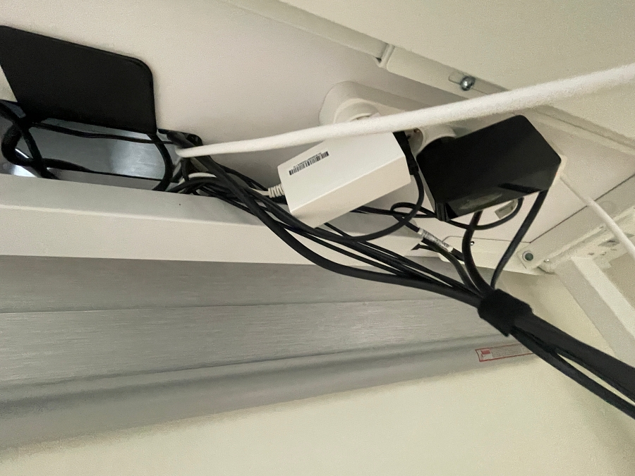 책상의 바로 밑에는 자체적으로 멀티탭이 붙어 있어서 이곳에 모니터, 컴퓨터 본체 등의 전원을 연결하고 상판 하부에 붙어있는 정리대에 선들을 걸쳐 놓으면 선들을 감쪽같이 정리할 수 있다. 필자의 경우 다소 귀차니즘이 심해 대충 정리를 했지만 본인이 원하면 더욱 깔끔하게 정리가 가능하다.