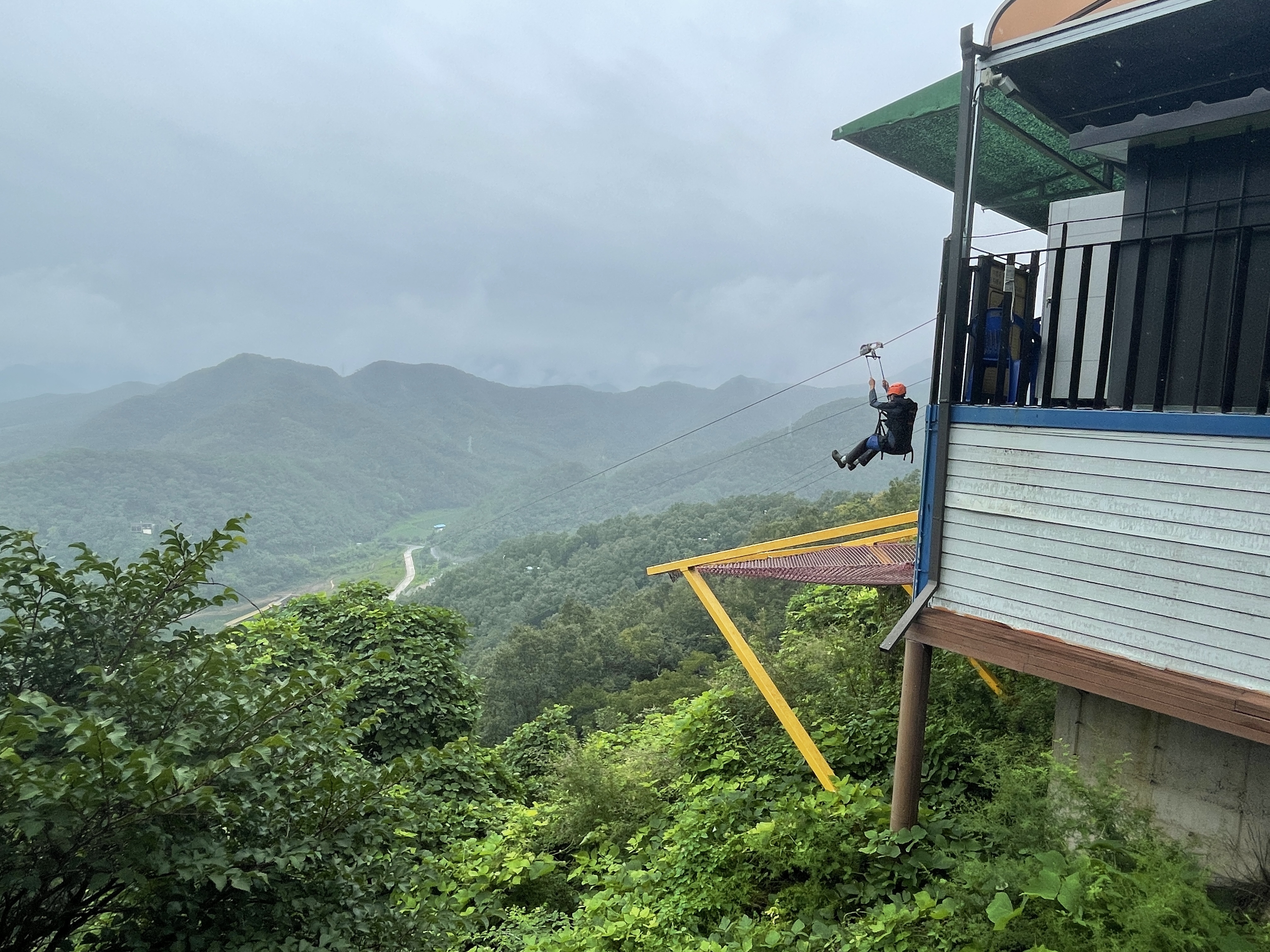 스카이워크 입구 바로 옆엔 아찔한 높이에서 내려가는 짚와이어를 타는 사람들을 만나볼 수 있다. 이곳에서 한번 내려갔다가, 중간지점에서 내리고 다시 중간지점에서 매표소 인근까지 내려가는 방식으로 되어 있어 집라인을 타고 싶다면 이곳까지 올라와서 탑승하면 된다.