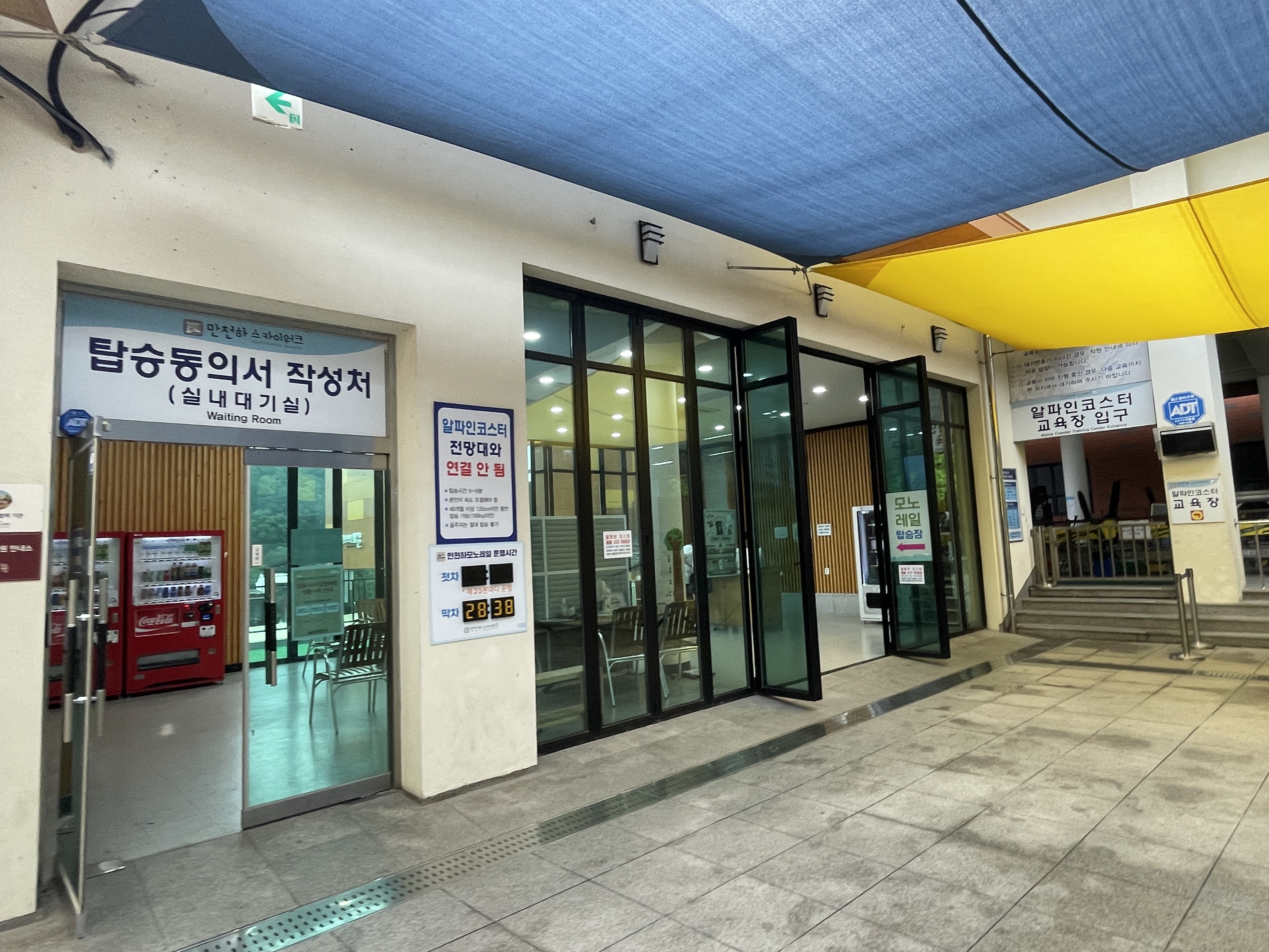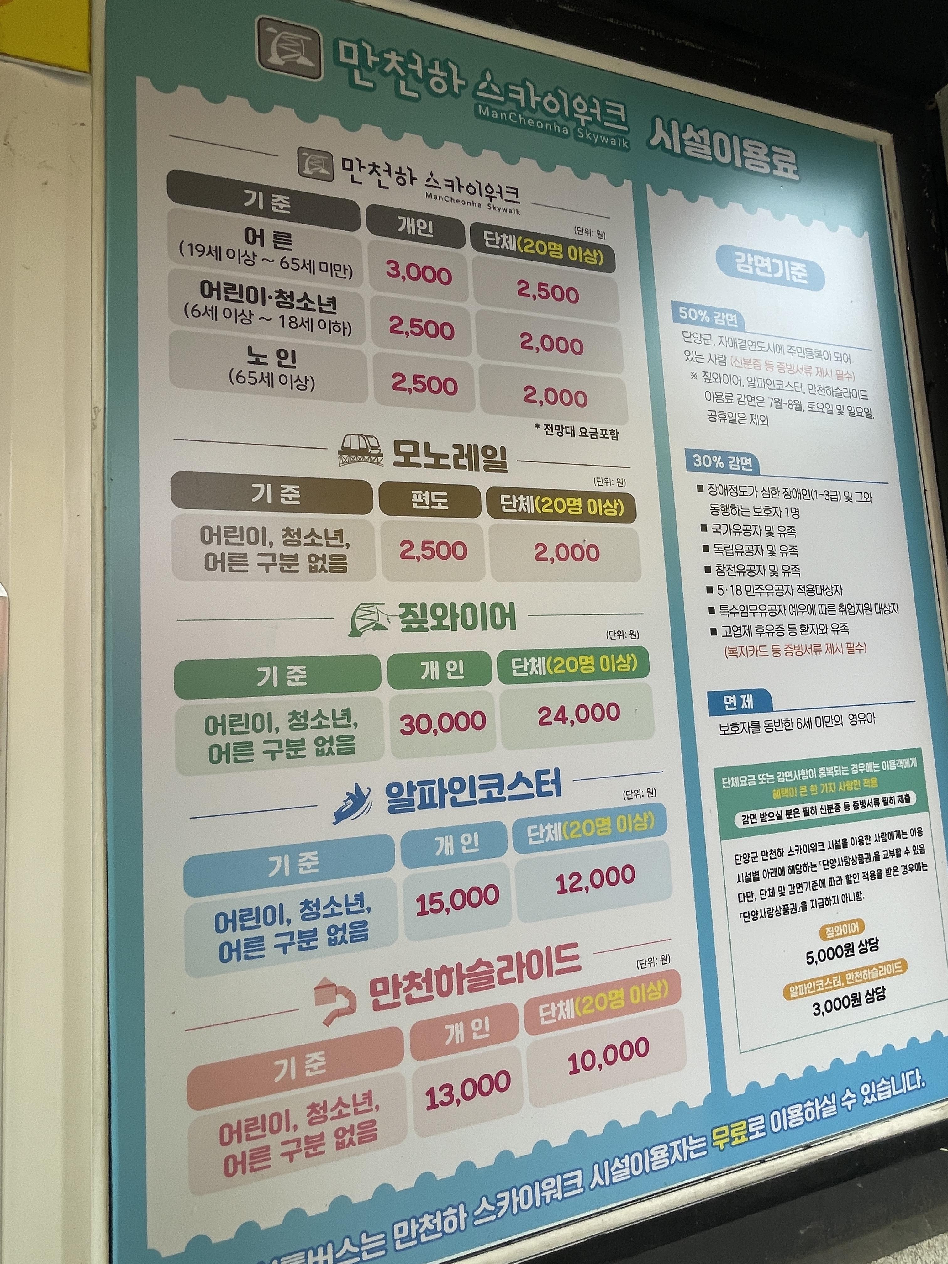 물론 만천하 스카이워크 역시 입장료가 있다. 성인 기준 1인당 3,000원인데 모노레일까지 탑승하면 5,000원이라는 비용이 발생한다. 모노레일 가격은 편도로 2,500원이기 때문에 일단 모노레일을 타고 올라간 다음 내려올 땐 버스를 이용하면 비용을 조금이라도 더 줄일 수 있다. 이날 우리 부부는 알파인 코스터를 타 보기로 하고 방문을 했었는데 아쉽게도 비가 조금씩 오는 바람에 알파인 코스터가 안전상 운영을 하지 않았다.