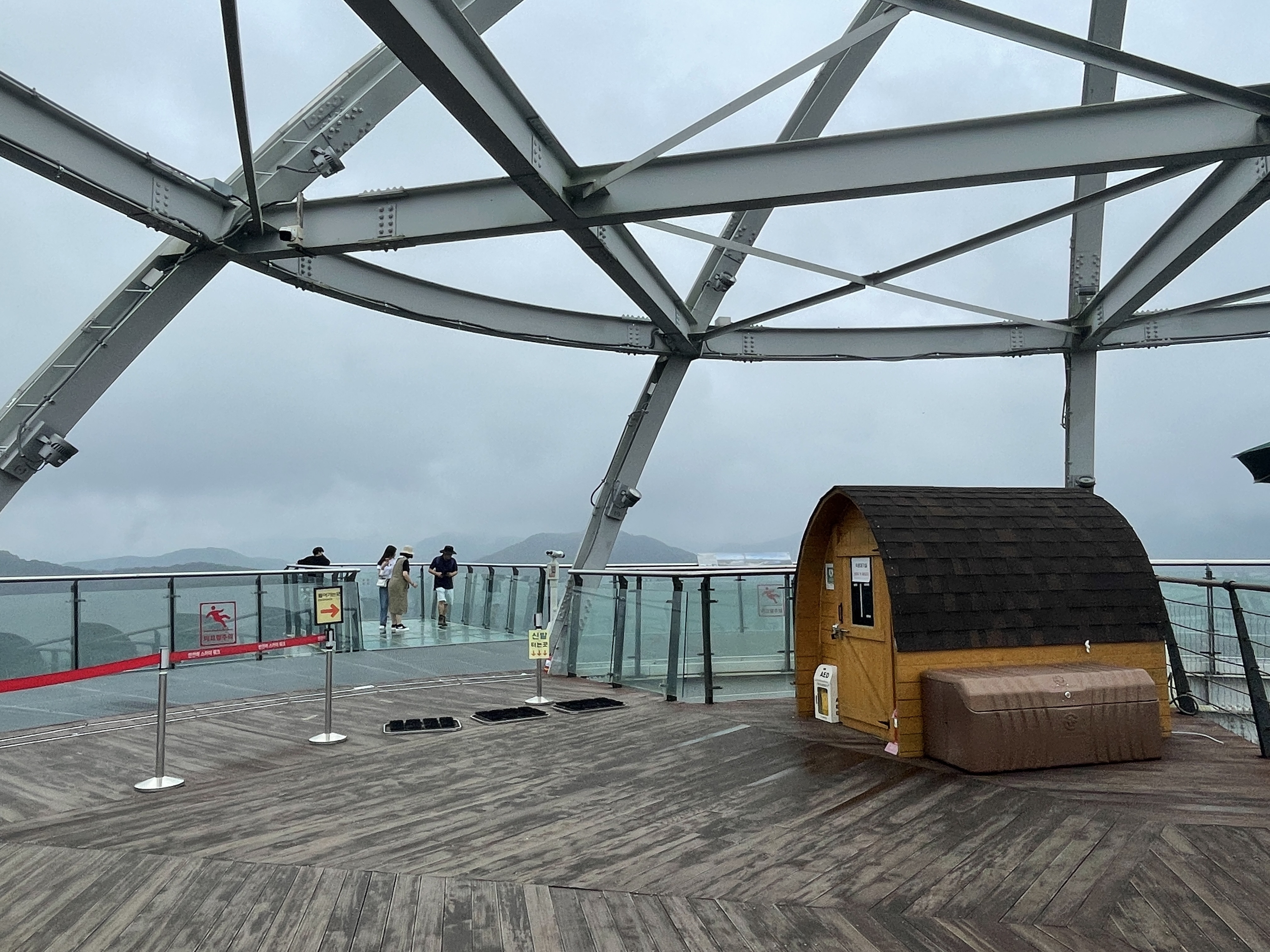 정상에 오르면 나무데크가 끝나게 되고 본격적으로 스카이워크라는 이름답게 철로 만들어져 밑바닥이 훤하게 내려다 보이는 구간이 시작된다. 여기서부턴 밑바닥을 한번 내려다 보면 고소공포증이 있는 사람들은 꽤나 아찔한 경험을 할 수 있다.
