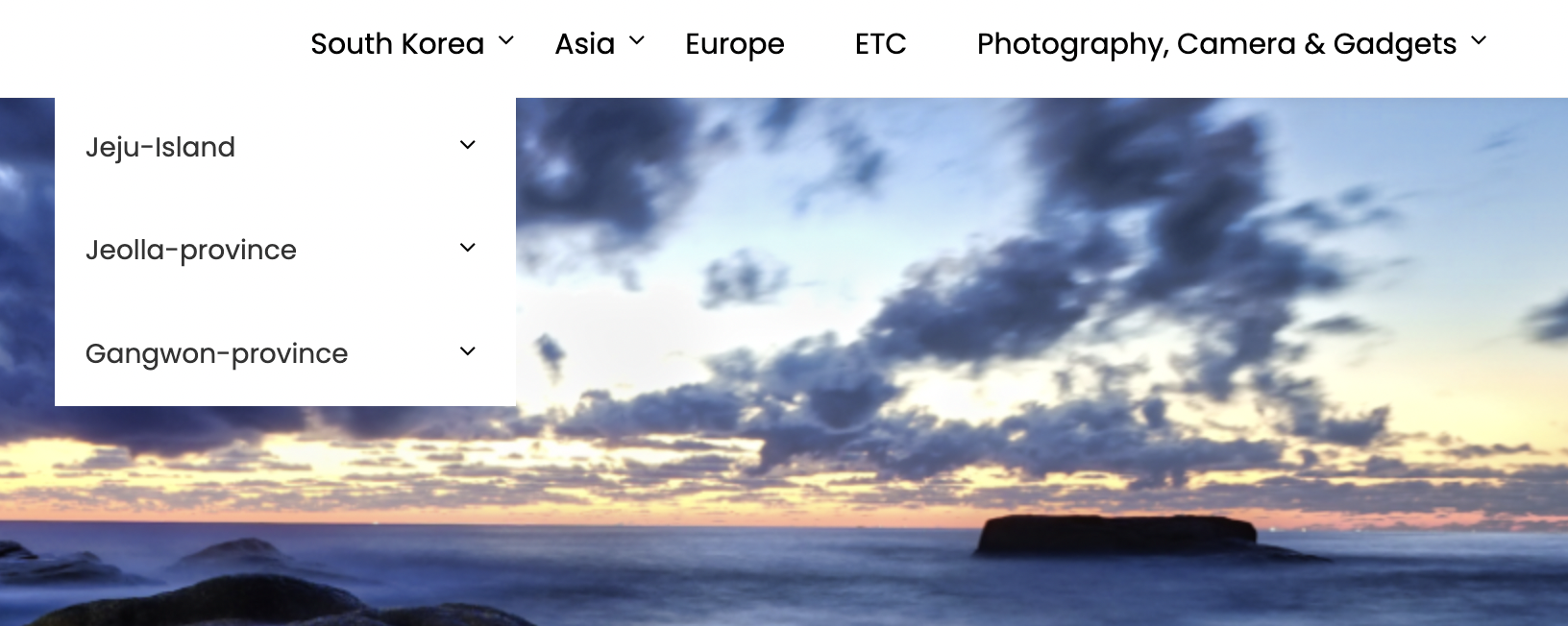 필자가 세팅한 테마 기준으로 가장 상위 메뉴(대분류)는 블로그의 메인에, 그리고 하위 분류는 마우스 커서를 갖다 대면 팝업창으로 나타나게 된다. 여기까지 했으면 메뉴, 카테고리를 세팅하는 과정이 모두 끝나며 글을 발행할 때 티스토리에서 글을 발행하는 것 처럼 카테고리를 지정해주면 해당 글이 위에 세팅해놓은 메뉴를 클릭할때 나타나는 페이지에 등록이 된다. 위를 잘 참고해서 자신만의 멋진 워드프레스 블로그를 잘 꾸며보도록 하자.