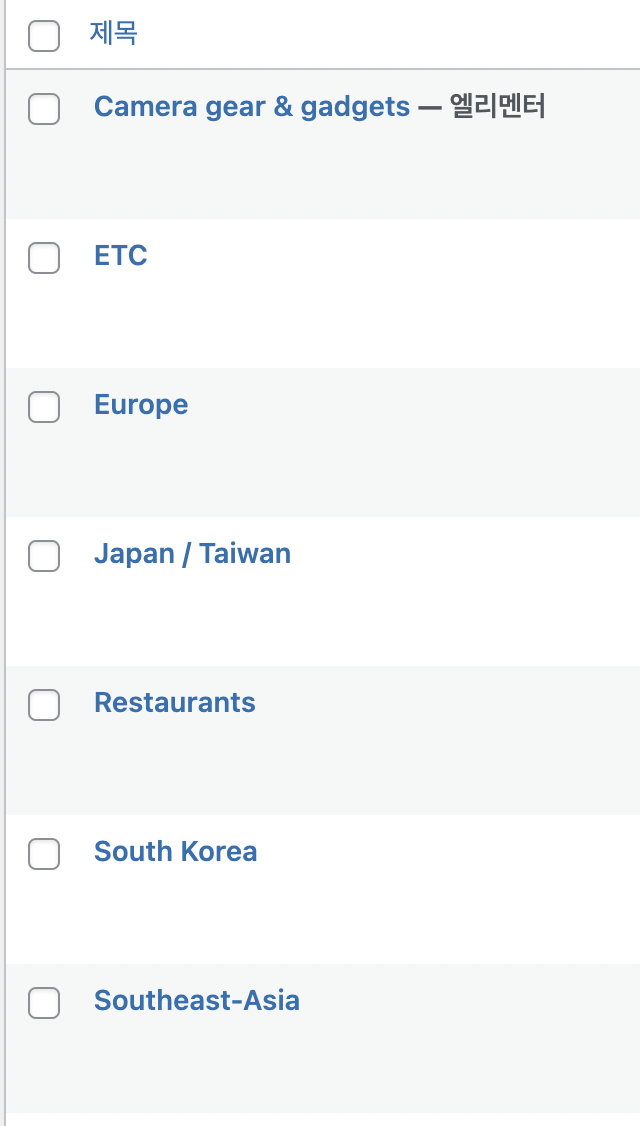 '메뉴'를 세팅하는 곳은 워드프레스의 '외모' 메뉴에서 중간 즈음에 위치한 '메뉴' 버튼을 클릭하면 페이지가 나타나게 된다. 이곳에서 먼저 설정하고 저장했던 카테고리들을 불러와야 한다. '메뉴 추가'에서 가장 아래쪽에 있는 '카테고리' 를 클릭하면 저장했던 카테고리들의 리스트가 쭉 나오게 된다. 여기서 추가하고자 하는 카테고리의 체크박스에 체크를 하고 아래 '메뉴에 추가'를 누르면 다음과 같은 바로 옆 창에 표시가 된다.